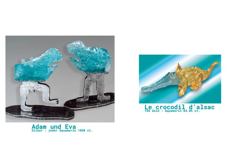 Mystik und Monster. Ein Untier: Minotaurus, der aus einem großen Aquamarin und einer Koralle besteht. Dieser Anhänger ist aus einem über vier Kilogramm schweren Rohstein eines Aquamarins mit stark zerklüfteter Oberfläche entstanden. Die Außenstruktur wurde belassen und in das Schmuckstück integriert: