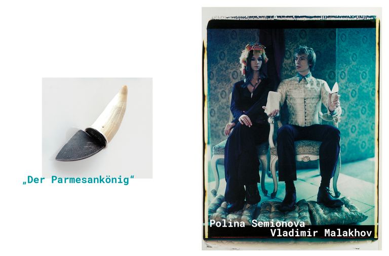 Holofernes“, wobei Judith der Legende folgend Holofernes’ Kopf auf einem Tablett trägt. So konnten wir es natürlich nicht ganz übernehmen. Deshalb haben wir uns entschlossen, einen Schweinskopf aus pinkem Opal mit einem Apfel aus Koralle in der Schnauze auf den goldenen Teller zu legen.