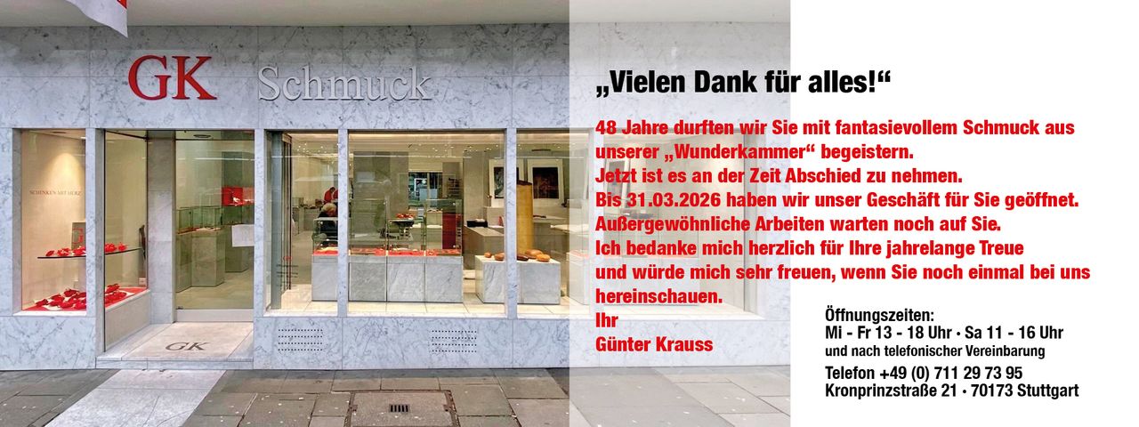 Ein Abend im Frühling. Und ein zweiter im späten Herbst. Schauplatz: Die Kronprinzstraße in Stuttgart. Hier wird eine Adresse zum Treffpunkt heiterer Geselligkeit. Die Einladungen sind begehrt, die Erwartungen werden wieder mal übertroffen, Wünsche erwachen. Und lassen sich erfüllen. So ist es seit fast 30 Jahren, wenn der Goldschmied und Schmuckdesigner Günter Krauss seine neuen Kollektionen präsentiert. „Keine Schönheit gibt es, die unter Juwelen nicht leuchtender würde.“ Worte eines klugen Mannes in einem alten türkischen Märchen. Wie wahr! Muss da nicht ein Leben im Dienst der vollendeten Symbiose von Schönheit und Juwelen einem Märchen gleichen? Kann nicht der als glücklich gelten, der immer wieder dieses Leuchten entzündet? Der die Schätze aus den urzeitlichen Tiefen der Erde vor sich ausbreitet, um sie mit Leidenschaft und außerordentlicher Kreativität nach seinem Bild zu formen und zum Glänzen zu bringen? Wir behaupten: Günter Krauss ist ein glücklicher Mensch.